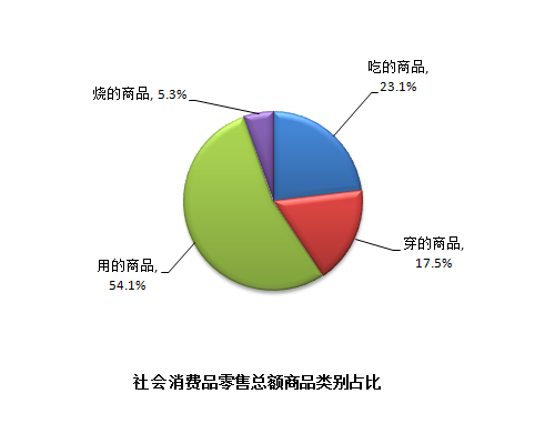 分商品类别看,上半年吃、穿、用、烧的商品零售额分别为1307.32亿元、990.91亿元、3072.13亿元和299.64亿元,分别增长11.9%、14.5%、4.1%和14.7%,分别占社会消费品零售总额的23.1%、17.5%、54.1%和5.3%。
