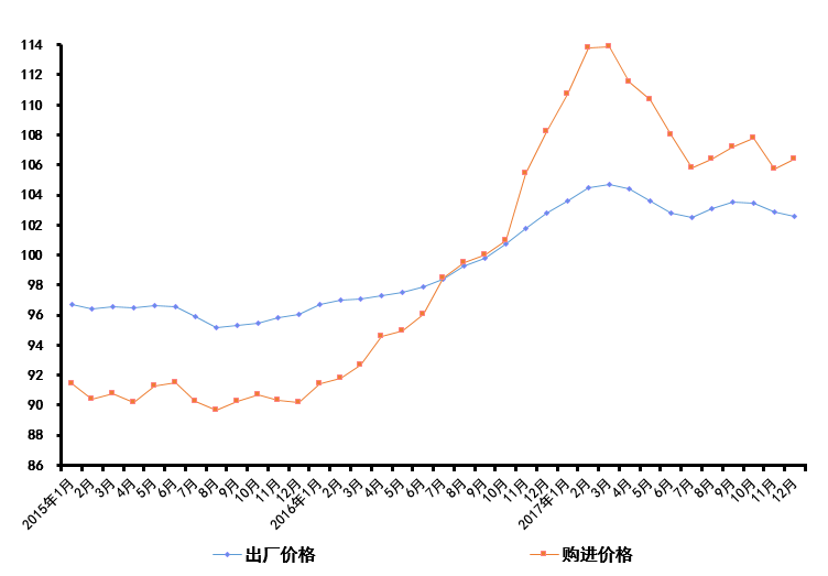 2018-02-11 来源:|212月份,本市工业生产者出厂价格比去年同月上升2.6%,升幅比上月收窄0.3个百分点;购进价格比去年同月上升6.4%,升幅比上月扩大0.7个百分点(见下图)。