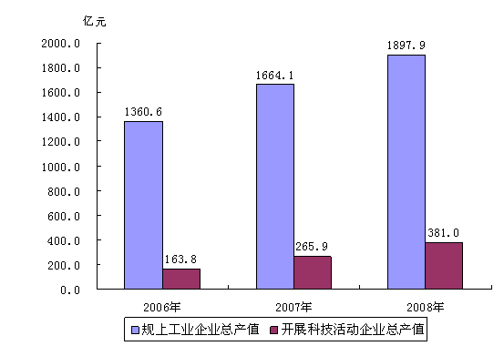 从工业总产值的增幅看,2006年至2008年,嘉定区全部规上工业企业总产值分别为1360.6亿元、1664.1亿元和1897.9亿元,平均增幅为18.1%。2006年至2008年,开展科技活动的企业总产值分别为163.8亿元、265.9亿元和381.0亿元,平均增幅为52.5%。由此可见,开展科技活动的企业其工业生产总值的增长速度明显快于全部规上工业企业总产值的增长水平,也必然快于无科技活动企业总产值的增长速度。在同样条件的大环境背景下,科技活动的开展更能够使企业充分发挥技术优势,有效地提高其工业产值。