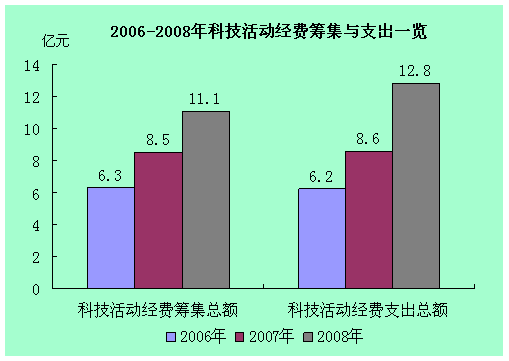 从科技活动经费筹集方面看,2006年至2008年,嘉定区规上工业企业经费筹集总额分别为6.3亿元、8.5亿元和11.1亿元,筹集经费数额逐年上升,平均增幅达32.7%。从科技活动经费支出方面看,2006至2008年,嘉定区规上工业企业科技经费支出分别为6.2亿元、8.6亿元和12.8亿元,平均增幅达43.7%。由此可见,企业在提高科技意识的同时,不断扩大对科技活动的经费投入和支出。企业科技经费投入与支出的大幅增长,为企业的科技研究和发展提供必要的资金保障。