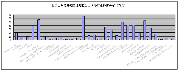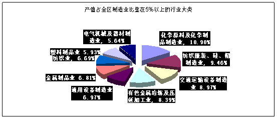 我区制造业行业产值比重占本区规模以上制造业5%以上的行业大类有:化学原料及化学制品制造业(10.9%)、纺织服装鞋帽制造业(9.46%)、交通运输设备制造业(8.97%)、有色金属冶炼及压延加工业(8.39%)、通用设备制造业(6.97%)、金属制品业(6.81%)、纺织业(6.69%)、塑料制品业(5.94%)、电气机械及器材制造业(5.64%)。我区行业产值占全市该行业比重5%以上的行业大类有:化学纤维制造业(28.61%)、有色金属冶炼及压延加工业(11.87%)、纺织服装鞋帽制造业(10.7%)、纺织业(10.21%)、皮革毛皮羽毛(绒)及其制品业(7.04%)、废弃资源和废旧材料回收加工业(6.96%)、农副食品加工业(6.19%)、饮料制造业(5.04%)。