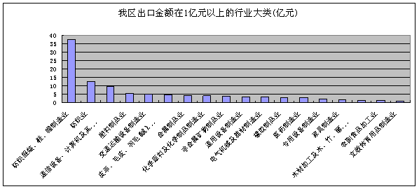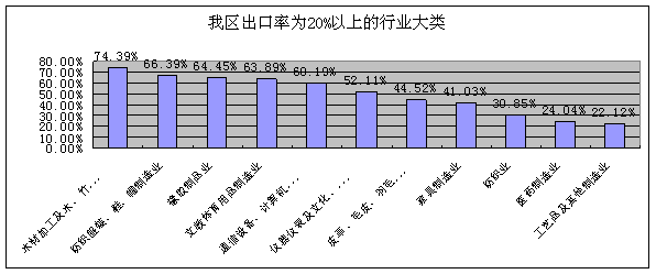 我区2008年制造业出口交货值约为110亿元,占全区制造业产值比重约18%。从行业大类的出口量来看,纺织服装鞋帽制造业出口金额最大,为37.6亿,占全区制造业出口比重为34%,第二位为纺织业,出口金额为12.3亿,占全区制造业出口比重为11.2%,第三位是通信设备、计算机及其他电子设备制造业,出口交货值为9.8亿,占全区制造业出口比重为8.9%,第四位是塑料制品业,出口交货值为5.6亿,占全区制造业出口比重为5%,其他行业如皮革毛皮羽毛绒及其制品业、金属制品业、交通运输设备制造业等出口交货值为4-5亿元。从行业大类的出口率来看,出口率(出口额/产值)在50%以上的行业分别为木材加工及木竹藤棕草制品业(74%)、纺织服装鞋帽制造业(66%)、橡胶制品业(65%)、文教体育用品制造业(64%)、通信设备、计算机及其他电子设备制造业(60%)、仪器仪表及文化、办公用机械制造业(52%)。
