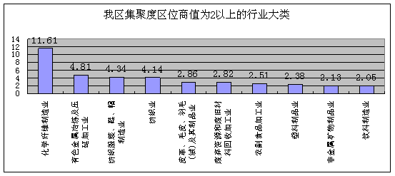我区部分行业在全市有一定的规模和集聚度,尽管我区制造业行业产值在全市制造业中的比重只有2.4%,但我区行业产值占全市该行业产值比重超过5%的大类行业有10个,比重超过10%的有4个。按照产业区位商集聚度的一般计算方式[3],我区有15个大类行业区位商集聚度大于1,表明这些行业有一定的专业化程度;有9个行业的区位商集聚度大于2,表明这些行业有一定的集聚度;我区一些行业的区位商非常高,如纺织业和纺织服装鞋帽制造业(区位商均超过4)、化学纤维制造业(区位商高达11.6)、有色金属冶炼及压延加工业(区位商为4.8),这些行业相对全市在我区已经形成了较高的产业集聚度,且近几年还趋于不断增强。