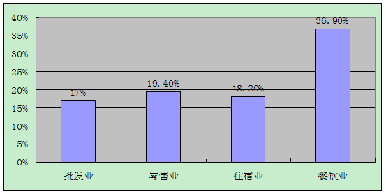 一季度限额以上零售额批发业、零售业、住宿业、餐饮业比重(%)3、住宿餐饮业仍为中坚力量随着城乡居民生活水平不断提高,外出消费观念不断发生变化,住宿餐饮企业不断更新经营理念,积极调整经营结构,使住宿餐饮业营业额维持了稳定增长,作为全区消费额的中坚力量,带动着消费总额增速的稳步上升。一季度,限额以上住宿和餐饮业实现营业额3.9亿元,占整个限额以上消费品市场零售额的12.5%,同比增长33.0%。其中住宿业营业额0.74亿元,增长18.2%;餐饮业营业额3.16亿元,增长36.9%,高于全区平均增速19.2个百分点。