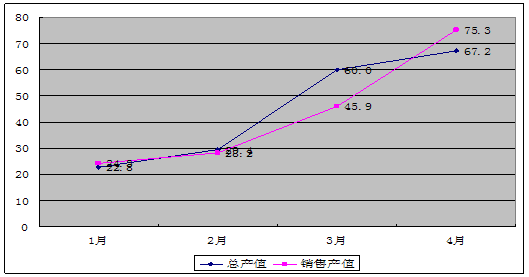 1、工业生产和销售增幅稳步提高、增速逐月加快今年以来,全县工业总产值和销售产值持续增长,增速呈现逐月加快趋势。从绝对数看,单月产值从1月的32.93亿元,上升至4月的41.74亿元;销售产值从1月的30.61亿元,上升至4月的39.88亿元。从相对数看,单月产值同比增速从1月的22.8%,上升至4月的67.2%;销售产值同比增速从1月的24.3%,上升至4月的75.3%。