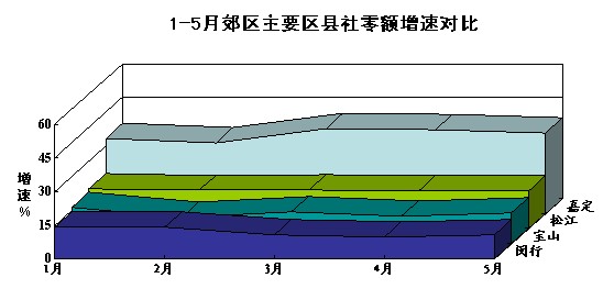 (二)消费增长稳定快速,增幅领先于其他区县。今年前五个月,我区社会消费品零售额增幅分别为33.5%、31.5%、37.7%、37.2%和35.8%,增长平稳而快速,单月增幅始终领先于其他区县;从绝对量看,赶超势头同样喜人。1-5月,郊区社会消费品零售额排名前三位的分别是闵行197.4亿元、宝山155.6亿元、松江136.4亿元。尽管嘉定位列第四,为133.1亿元,但与第三位的松江差距缩小至3.3亿元(去年同期为18.9亿元)。以现在的发展情况估算,今年上半年我区社会消费品零售额规模将有望进入郊区前三。