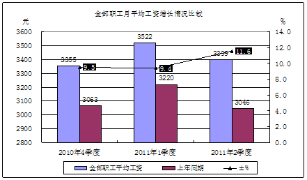二、受政策积极影响,平均工资合理增长我区从2010年四季度开始到2011年二季度,平均工资一直保持了较高的增长速度,尤其是今年二季度的工资涨幅较大,新的最低工资标准的引导作用已经显现。