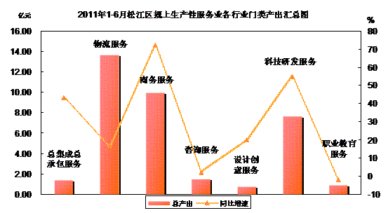 从生产性服务业的各行业门类来看,“物流服务”的产出最大,为13.65亿元;“商务服务”的增速最快,同比增长72.3%。宜家采购(上海)有限公司、龙工(上海)融资租赁有限公司和上海佳豪船舶工程设计股份有限公司作为我区社会服务业的三家生产性服务业龙头企业,总产出为12.99亿元,同比增长29.3%,比同期社会服务业总产出增速高8.2个百分点。它们分别代表的“物流服务”、“商务服务”、“总集成总承包服务”在7个生产性服务业行业门类中,产出较大、增速较快,对社会服务业发展起拉动作用,也是企业规模效益的体现。