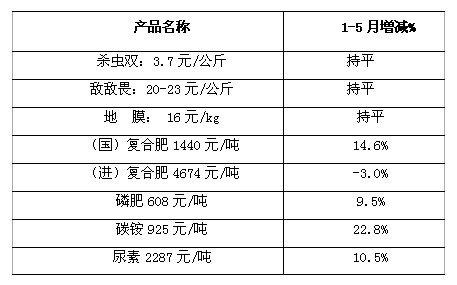 (四)农业生产资料价格上涨。从有关部门获悉,现行农资零售价格由于人工、煤炭、石油等农资上游原材料价格影响,加之受成品油价格大幅上涨的影响,农资产品运输成本增加等,也推动了农资销售价格的上升。至5月底,除有部分农资商品持平和小幅下跌外,其余农资商品价格均呈上涨态势(详见下表)。