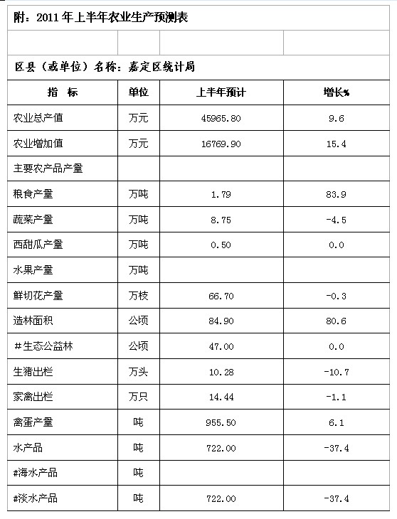 嘉定区统计局 2011-08-04今年以来,全区认真贯彻落实中央和全市农村工作会议精神,紧紧围绕夯实农业基础、促进现代农业发展,及早谋划春季各项农业生产,着力抓好农业结构调整,确保农业经济平稳发展。初步统计,上半年全区实现现价农业总产值49138万元,同比增长17.3%;农业增加值16769.9万元,同比增长15.4%。