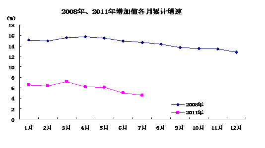 从1-7月的全区经济运行情况看,今年的经济走势类似于2008年金融危机时期,从下图可以看出,2008年全区经济以15.1%开局,上半年基本保持在15%以上的增势,从下半年起受金融危机影响增速下滑比较明显,至年底增速为12.8%;2011年全区经济以6.5%开局,1-5月基本保持平稳态势,从6月起增速下滑较明显。(2008年、2011年增加值累计增速见下图)