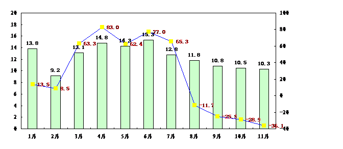 11月份,全县完成出口交货值10.3亿元,较上月减少0.2亿元,同比下降36.1%,比上月多下降7.2个百分点;1-11月,全县累计完成出口交货值136.5亿元,同比下降2.2%。单月同比降幅为今年最大,累计出口总量由增转减。