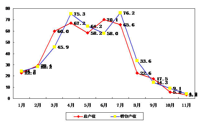 11月份,全县完成工业总产值37.9亿元,同比增长3.2%,增幅较上月回落2.6个百分点;完成销售产值35.7亿元,同比增长4.2%,增幅较上月回落4.9个百分点。因海洋装备业经营持续下滑,单月产销同比增幅进一步回落。