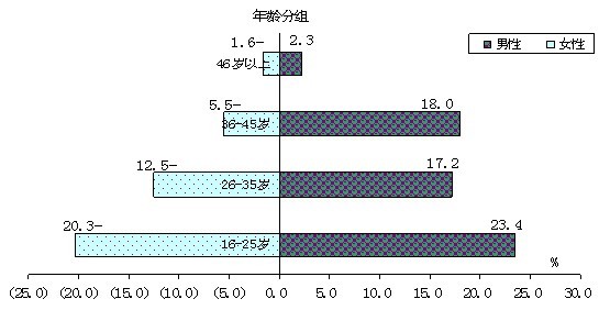 松江外来农民工以青壮年为主,平均年龄为38.2岁,其中16-25岁的占43.7%,25-35岁的占到29.7%,36-45岁的占23.5%,46岁以上的仅占3.9%;从性别结构看,男性人数占60.9%,女性人数占39.8%,男性多于女性。从男女年龄分布来看,男性集中在16-45岁,占58.6%,女性则更多的集中在16-35岁,占32.8%。女性年龄整体低于男性。
