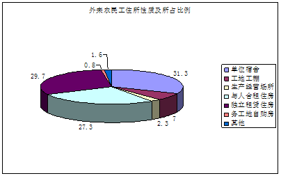 (1)住房情况:从住房性质来看,被调查农民工住单位宿舍的占31.3%、单独租赁住房的占29.7%、与人合租住房的占27.3%,其他工地工棚、生产经营场所、务工地自购房和其他分别占7%、2.3%、0.8%和1.6%;从住房类型来看,被调查农民工多居住在农民自建房,占70.3%,住在多层商品房的占21.6%,高层商品房的仅占8.1%,超过七成的外来农民工仍然居住在农村;从人均居住面积来看,5平方米以下的占8%,5-10平方米的占42.7%,11-20平方米的占36%,21-50平方米的占12%,50平方米以上的仅占1.3%,5-20平方米占了78.7%。