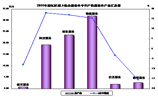 2011年全区规上社会服务业总产出为151.92亿元,同比增长9.5%。按单位类型来看,其中企业为82.85亿元,同比增长9.6%;事业为65.80亿元,同比增长8.7%;社团及其他单位为3.27亿元,同比增长23.8%。按行业门类来看,其中产出绝对量最大的是“教育”,该行业产出总量为37.62亿元;增长速度最快的是“水利、环境和公共设施管理业”,较上年同期增长60.0%。