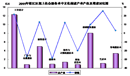 从总产出看,全区规上社会服务业中文化创意产业总产出为34.04亿元,占规上社会服务业比重为22.4%;同比增速为10.0%,其增速高于社会服务业平均水平0.5个百分点,对社会服务业的结构调整起推动作用。