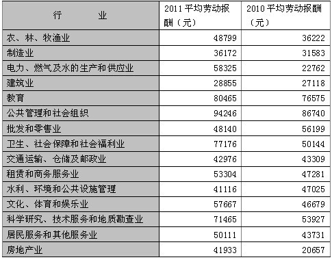 年报资料显示,2011年三上企业和区属单位共发放从业人员劳动报酬74.6亿元,其中:发放在岗职工劳动报酬67.18亿元,劳务派遣人员5.08亿元,其他从业人员2.34亿元。2011年从业人员每人每年平均劳动报酬为40518元,其中:在岗职工为41256元,其他从业人员平均劳动报酬为37450元。