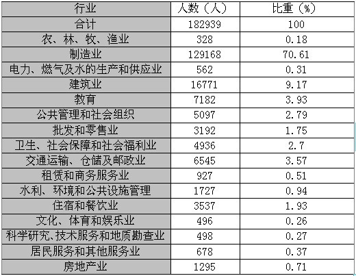 从分行业看,制造业从业人员占比重最大,其次是建筑业。分行业从业人员比重详见下表: