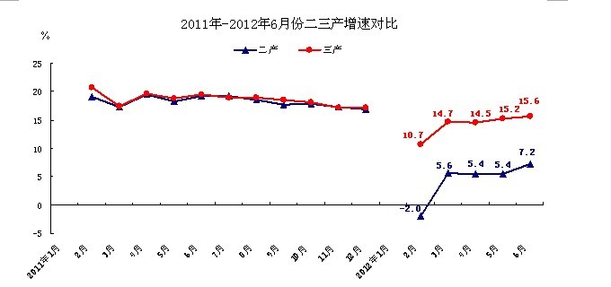 上半年第二产业实现增加值144.6亿元,同比增长7.2%,二季度环比增长13.9%,第三产业增加值实现86.8亿元,虽绝对额少于第二产业,但增速却达到15.6%,高出第二产业8.4个百分点,二季度环比增长14.9%,比第二产业环比增速高出1个百分点,第三产业占比比去年同期提升了1.8个百分点。上半年,社零额实现146.1亿元,同比增长14.1%,继续保持两位数增长。总体来看,我区第三产业发展好于第二产业。