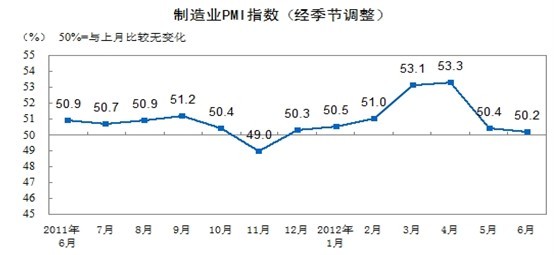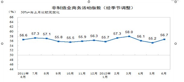 国家6月份制造业采购经理指数(PMI)为50.2%,比上月回落0.2个百分点,为今年的新低,制造业扩张速度进一步放缓;非制造业商务活动指数为56.7%,比上月上升1.5个百分点,继续位于临界点—50%以上,表明非制造业经济活力有所增强。