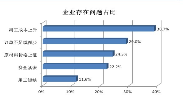 一是招工难及不断增加的劳动成本增加了企业的生存压力。666家企业选择用工成本上升的有258家,占比38.7%,为各类选项之最;另有77家选择用工短缺,占比11.6%。二是受欧美市场影响,产品订单减少选择订单不足或减少的企业有193家,占比29.0%。三是原材料上涨,成本增加,利润空间很小。选择原材料价格上涨的有162家,占比24.3%。四是资金短缺仍是制约企业发展的瓶颈,选择资金紧张的有148家,占比22.2%。