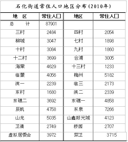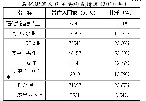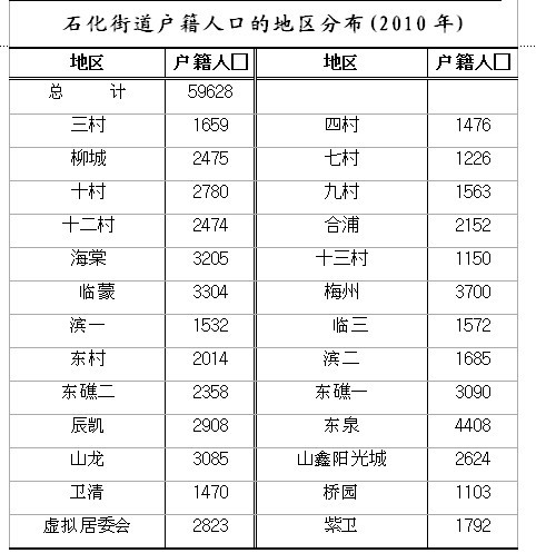石化街道“六普”户籍人数为59628人,同“五普”的 73381人相比,十年共减少了13753 人。主要原因是:1、部分居民为了孩子能进重点学校,将孩子的户口迁到了学区房。2、越来越多的石化居民到附近乡镇购买商品房,同时将户口迁出。3、石化股份公司体制改革,致使部分职工脱离石化系统,搬离石化地区,户口亦随之迁出。