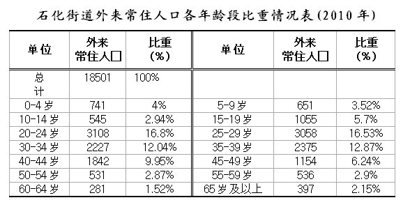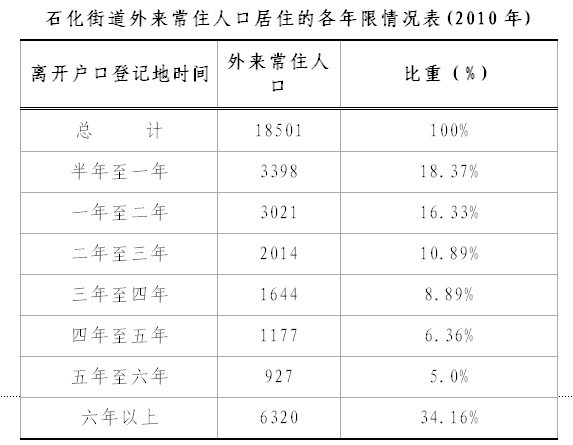 石化街道“六普”外来人口19340人,其中外来常住人口18501人。同“五普”的 8191人相比,十年共增加了 11149人,增长136.11%。
