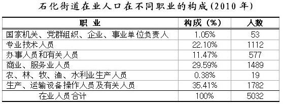 通过对“六普”资料的汇总、分析,我们发现石化街道在业人口随着社会、经济的发展,发生了较大的变化。“六普”分长、短表登记,本文将街道10%的长表,抽取3730户,常住人口8754人,对在业人口的职业现状进行了分析(在业人口是指15周岁及15周岁以上,且从事一定的社会劳动并取得劳动报酬或经营收入的人)。我们石化街道15周岁到60岁67825人。