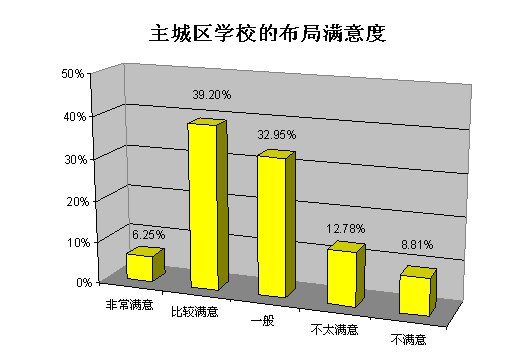 2、近半调查对象表示对青浦主城区学校的布局表示满意。调查结果显示,当问及“您对青浦主城区学校(幼托、小学、中学、高中)的布局是否满意”时, 44人选择非常满意,占6.25%;276人选择比较满意,占39.2%;232人选择一般,占32.95%;90人选择不太满意,占12.78%;62人选择不满意,占8.81%。