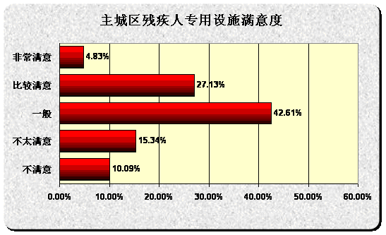 (三)、社会保障设施近三成调查对象表示对青浦主城区的残疾人专用设施表示满意。调查结果显示,当问及“您对青浦主城区的残疾人专用设施是否满意”时,34人选择非常满意,占4.83%;191人选择比较满意,占27.13%;300人选择一般,占42.61%;108人选择不太满意,占15.34%;71人选择不满意,占10.09%。