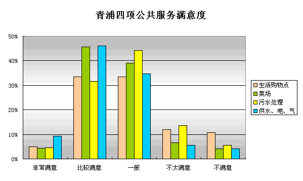 4、过半调查对象表示对青浦现有的供水、供电、供气表示满意。调查结果显示,当问及“您对青浦现有的供水、供电、供气是否满意”时, 65人选择非常满意,占9.23%;325人选择比较满意,占46.16%;244人选择一般,占34.66%;39人选择不太满意,占5.54%;29人选择不满意,占4.12%。