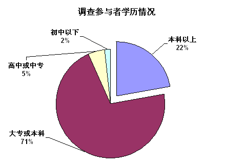从学历状况看,本科以上占22.16%,大专或本科占71.31%,高中或中专占4.97%,初中以下占1.56%,调查参与者以高学历居多。见下图: