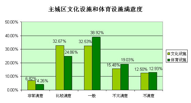 3、近四成调查对象表示对青浦主城区文化设施设置表示满意。调查结果显示,当问及“您对青浦主城区文化设施(群艺馆、图书馆、音乐厅、青少年活动中心、文化宫、文化馆、影剧院和新华书店等)设置是否满意”时, 48人选择非常满意,占6.82%;230人选择比较满意,占32.67%;229人选择一般,占32.53%;109人选择不太满意,占15.48%;88人选择不满意,占12.5%。
