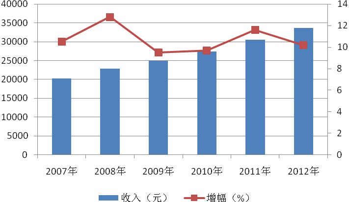 图1 2007年—2011年城镇居民家庭人均可支配收入及增长情况