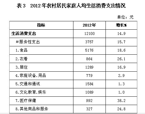2012年,农村居民家庭人均食品消费支出5176元,比上年增长18.6%,其中,谷物消费增长11.9%,食用油增长16.8%,蔬菜及制品增长14.6%,肉、禽、蛋、奶及制品增长16.8%,水产品及制品增长 21.3%,烟酒增长19.1%。