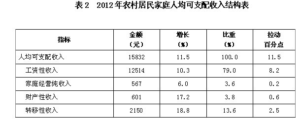 1、工资性收入保持稳步增长,是拉动可支配收入增长的首要力量。在最低工资标准的提高、新增就业岗位等因素的作用下,2012年,金山区农村居民家庭人均工资性收入为12514元,比上年增长10.3%,工资性收入占可支配收入的比重达79%,拉动可支配收入增长8.2个百分点,是可支配收入增长的首要拉动力。
