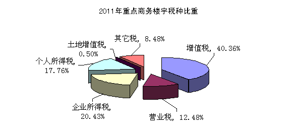 幢重点商务楼宇税收总额中,按税种结构分,增值税比重最高,2011年达到51.23亿元,占总量40.36%。其次分别是企业所得税、个人所得税和营业税。