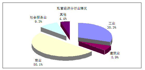 从比重来看,全区私营经济仍以工业和商业为主,占全区的比重达到了80.4%。私营工业企业实现销售或营业收入895.64亿元,占全区私营经济比重30.3%;建筑业企业实现销售或营业收入175.73亿元,占全区私营经济比重5.9%;商业企业实现销售或营业收入1482.15亿元,占全区私营经济比重50.1%;社会服务业企业实现销售或营业收入275.36亿元,占全区私营经济比重9.3%;其他企业实现销售或营业收入129.56亿元,占全区私营经济比重4.4%。私营经济中工业和商业的比重比去年同期下降1.7个百分点,社会服务业比重提高了0.8个百分点,建筑业比重提高了0.8个百分点,其他行业比重提高了0.1个百分点。