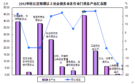 总量逐步扩大:2012年全区规模以上社会服务业总产出为184.26亿元。其中,企业实现产出106.62亿元,事业实现产出74.60亿元,社团及其他单位实现产出3.04亿元。按行业门类看,产出绝对量较大的是“教育”、“交通运输、仓储和邮政业”和“租赁和商务服务业”,行业产出分别为44.19亿元、39.40亿元和38.36亿元。