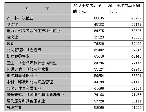 从国民经济行业分类看,从业人员平均劳动报酬存在一定的差距,差距较上年有明显下降,2011年最高的行业为公共管理和社会组织,年均为94246元,2012年下降为89402;2011年最低的行业为建筑业,为28855元,2012年上升至39323元。详见下表: