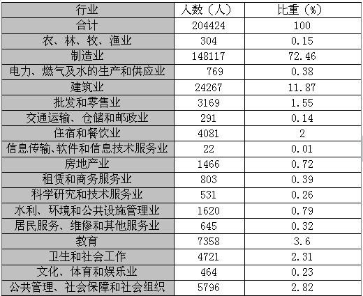从分行业看,制造业从业人员占比重最大,其次是建筑业。分行业从业人员比重详见下表: