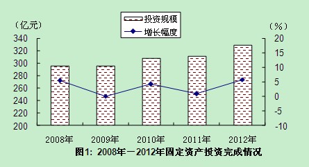 年,全区完成固定资产投资329.28亿元,再创历史新高,同比增长5.8%,增幅比上年提高4.9个百分点,是2008年以来增幅最高的一年。纵观近5年投资运行轨迹,全区固定资产投资总量水平保持着稳中有升的运行格局(见图1)。