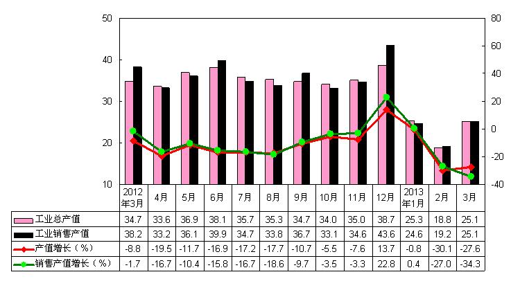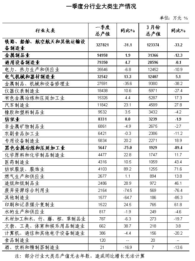 一季度,六大重点行业完成总产值54.86亿元,同比下降22.1%,降幅高于全县工业0.9个百分点。其中3月份单月六大重点行业完成总产值20.09亿元,同比下降28.9%,降幅高于全县工业1.3个百分点;可见重点行业非但未能体现支撑作用,反而拉低全县工业降幅。其原因一方面是由于经济大环境不景气,一方面是由于产业结构调整逐渐深入,高投入、低产出,高能耗、低收益的纺织业、黑色金属冶炼和压延加工业企业相继停产关闭,由此拉低了六大重点行业的经济总量和同比降幅。