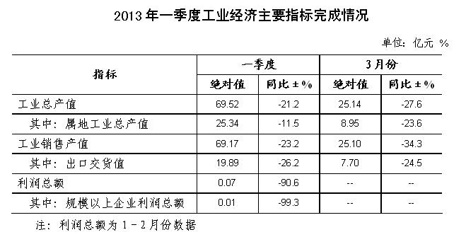 产销方面,从生产看,一季度累计完成工业总产值69.52亿元,同比下降21.2%;其中属地工业总产值25.34亿元,同比下降11.5%。从销售看,一季度累计完成销售产值69.17亿元,同比下降23.2%;其中属地工业销售产值24.46亿元,同比下降16.4%。从出口看,一季度累计完成出口交货值19.89亿元,同比下降26.2%。