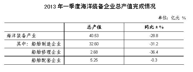 一季度,全县海洋装备产业累计完成总产值40.53亿元,同比下降28.8%。具体来看,以江南造船集团下属各公司为代表的船舶制造企业,共计完成总产值32.60亿元,同比下降31.2%,降幅比平均水平扩大2.4个百分点。以中海长兴、华润大东为代表的船舶修理企业,共计完成总产值2.68亿元,同比下降36.4%,降幅比平均水平扩大7.6个百分点。以振华港机集团下属各公司为代表的船舶配套企业,共计完成总产值5.25亿元,同比下降0.3%,降幅远远低于平均水平。