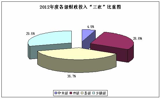 (一)财政投入“三农”资金总量大幅增长。2012年,我县“三农”资金共投入26.4亿元,同比增长19.5%,其中中央级资金1.3亿元,同比增长62.5%;市级资金7.6亿元,同比增长43.4%;县级资金9.7亿元,同比增长3.2%;乡镇级资金7.8亿元,同比增长18.2%。(见下表)