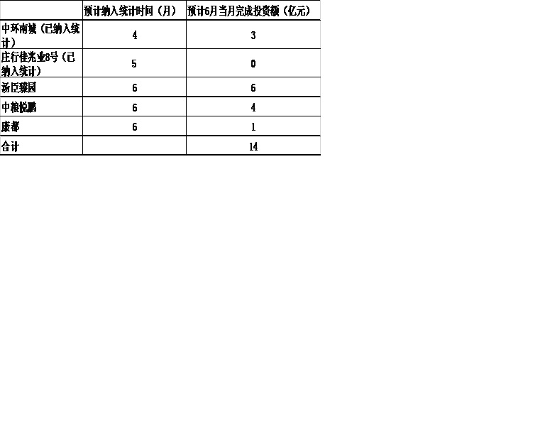 二季度将共有5个房地产项目陆续开工并纳入统计(中环南城、庄行佳兆业8号已纳入统计),预计6月当月完成投资14亿元,拉动上半年全社会固定资产投资增长9.8个百分点。