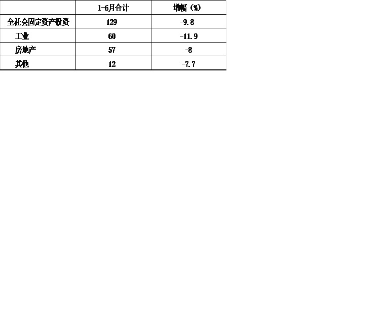 (二)固定资产投资情况预测受到新开工房地产项目拉动,固定资产投资降幅将进一步收窄。预计6月份当月完成全社会固定资产投资29亿元左右,1-6月全社会固定资产投资129亿元,同比下降9.8%,完成全年计划的41%。预计工业投资完成60亿元、房地产投资完成57亿元。
