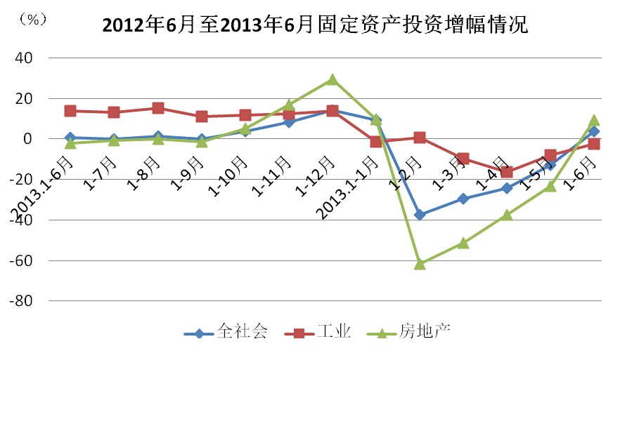 (二)固定资产投资由负转正,房地产投资拉动明显1-6月份,全区固定资产投资完成投资148.45亿元,同比增长3.8%,比一季度增幅提高33.4个百分点。其中,工业投资66.52亿元,同比下降2.3%,比一季度降幅收窄7.4个百分点,拉低全社会固定资产投资1.1个百分点;房地产投资67.71亿元,同比增长9.3%,比一季度增幅提高60.7个百分点,拉动全社会固定资产投资增长4.0个百分点。
